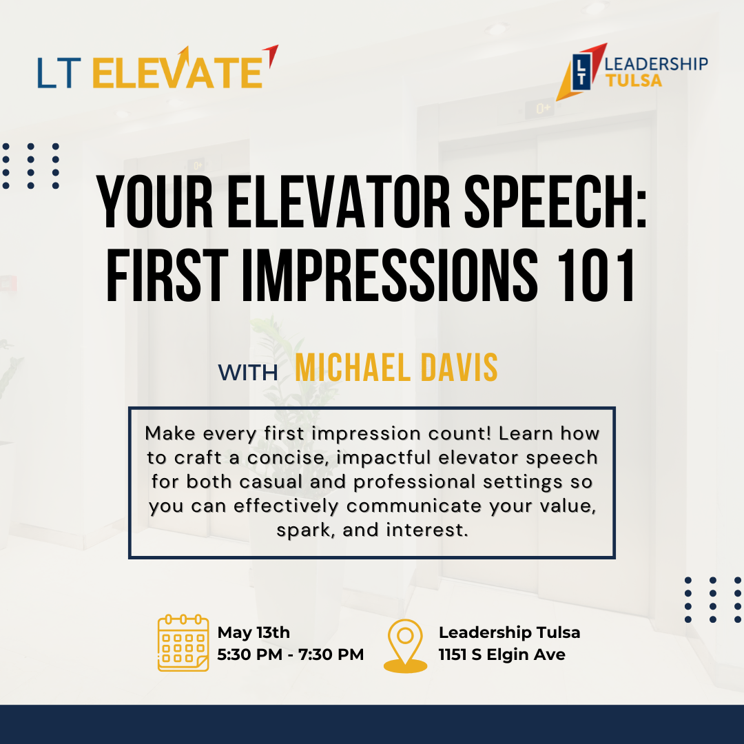 Welcome to LT Elevate, a transformative series of workshops and experiences specifically designed to empower Leadership Tulsa alumni and community members to reach new heights in their personal and professional leadership journeys. Through interactive workshops and engaging activities, LT Elevate provides invaluable opportunities to enhance leadership skills and cultivate adaptive management techniques. Join other local leaders committed to community and service, forge meaningful connections, and continue your development journey with LT Elevate.