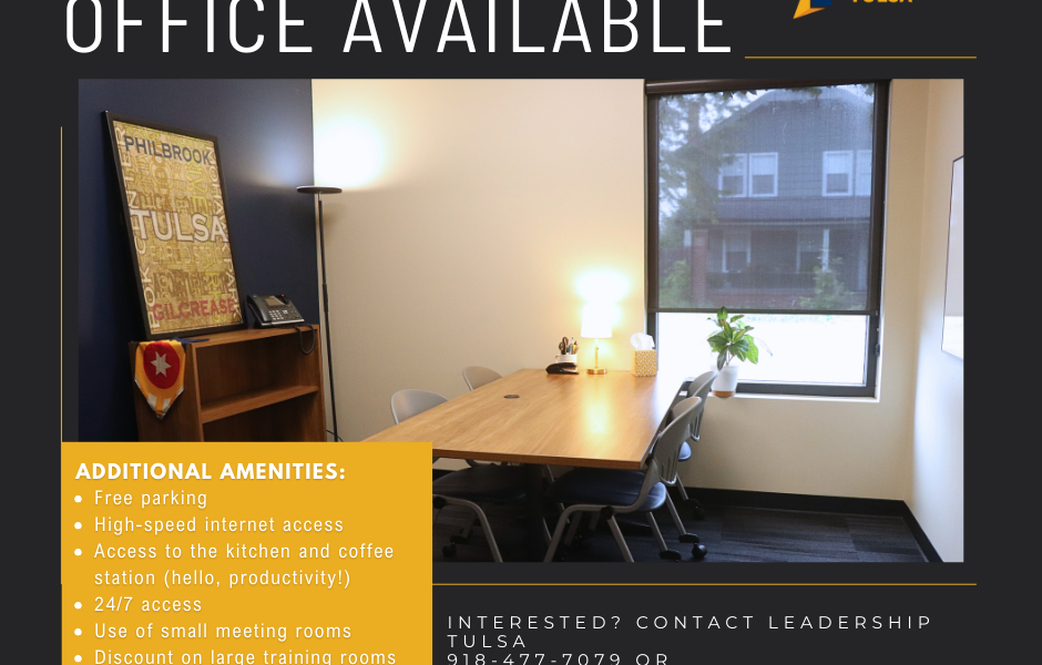 Leadership Tulsa will has one office available for sublease in our Leadership Center – a 7,800 square foot facility in historic Gunboat Park, located inside the IDL (one block south… CONTINUE